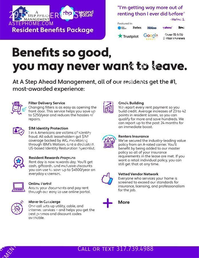 All A Step Ahead Management residents are enrolled in the Resident Benefits Package (RBP) for $45/month which includes renters insurance, credit building to help boost your credit score with timely rent payments, $1M Identity Protection, HVAC air filter delivery (for applicable properties), move-in concierge service making utility connection and home service setup a breeze during your move-in, a best-in-class resident rewards program, and much more! More details upon application approval.