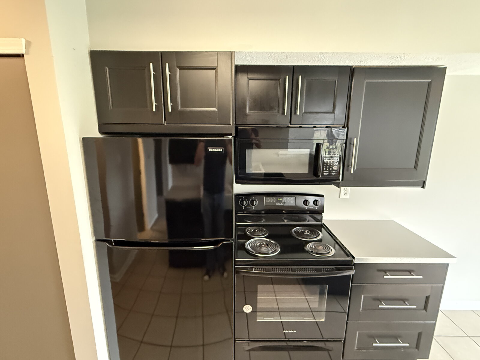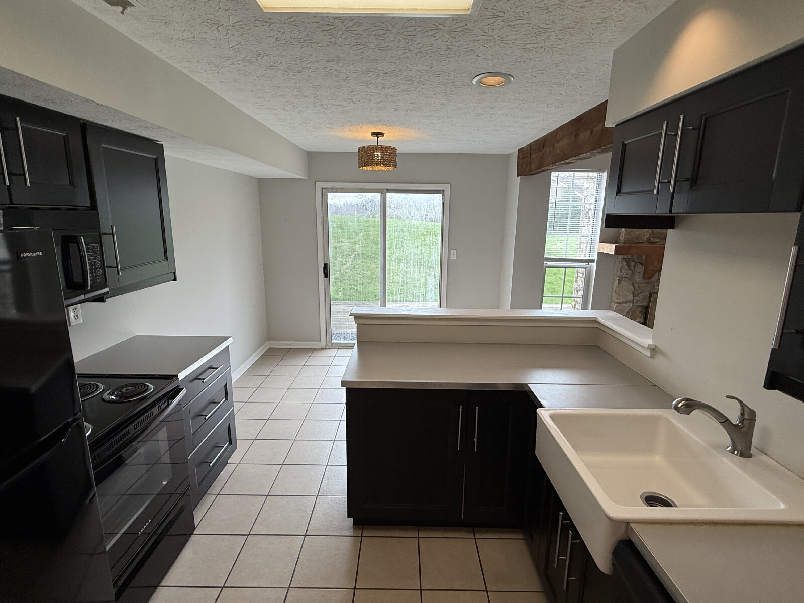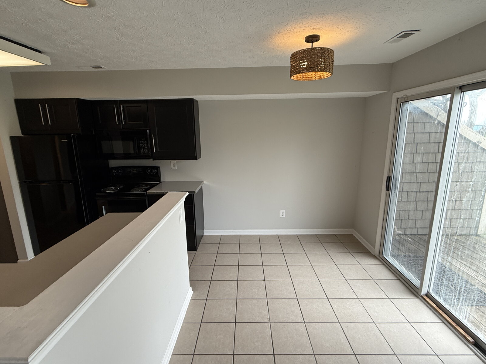 The kitchen is equipped with essential appliances including a stove, refrigerator, microwave, and dishwasher, along with ample cabinet and countertop space for storage and meal prep. The adjoining dining area features direct access to the backyard, making indoor-outdoor living simple and convenient.